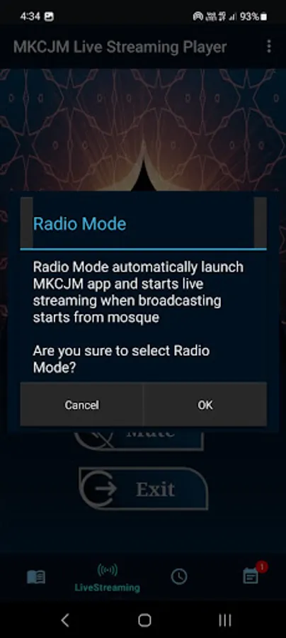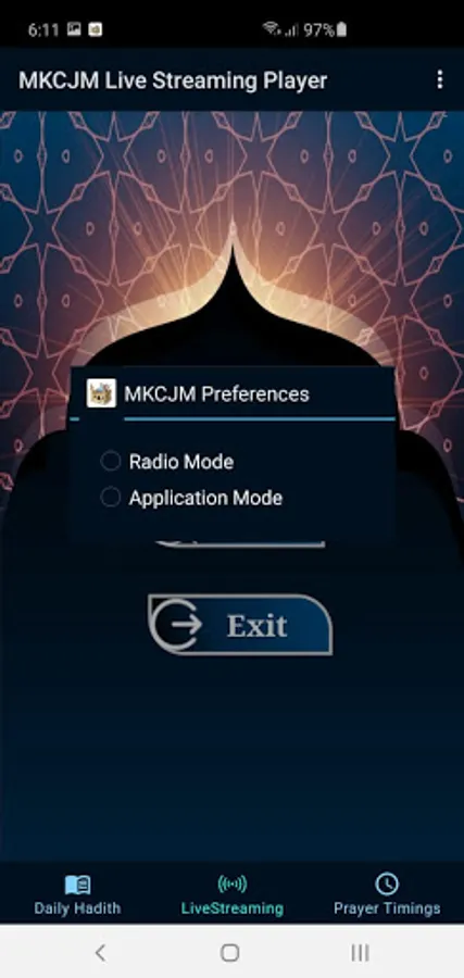 Radio mode is for android only. In this mode when the mosque starts live feed app will open itself and starts playing, you don't need to click anything to start listening.