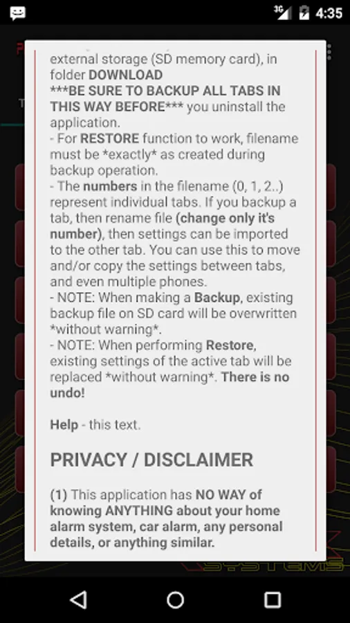 ***BE SURE TO BACKUP IN THIS WAY BEFORE*** ever (un)installing the applicationl! Otherwise, Android erases all it's files and settings during uninstall. More details in "BACKUP-RESTORE" below.