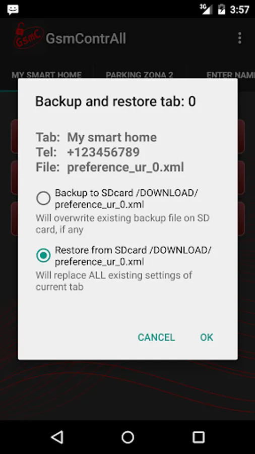 ***BE SURE TO BACKUP IN THIS WAY BEFORE*** ever (un)installing GsmContrAll! Otherwise, Android erases all it's settings during uninstall. Backup made in this way (to SD card) is not touched. More details in "BACKUP-RESTORE" below.