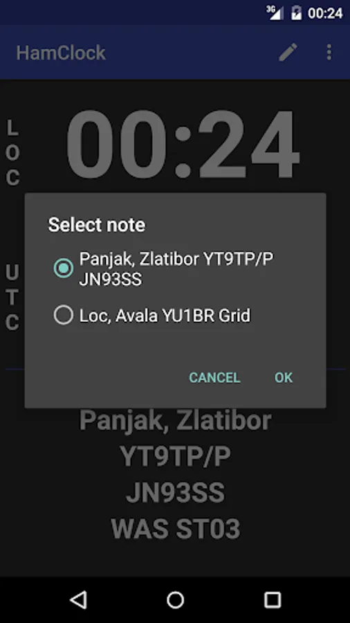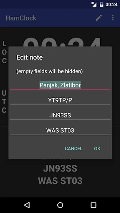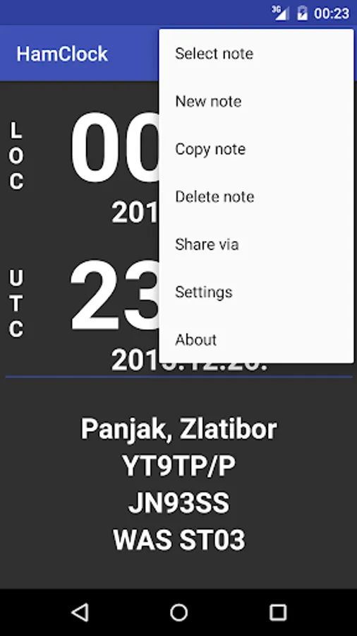 Note can be entered in up to four fields. Use it to record location name, QTH locator, callsign, activation details for SOTA, WCA, WFF or other activities, event info etc.