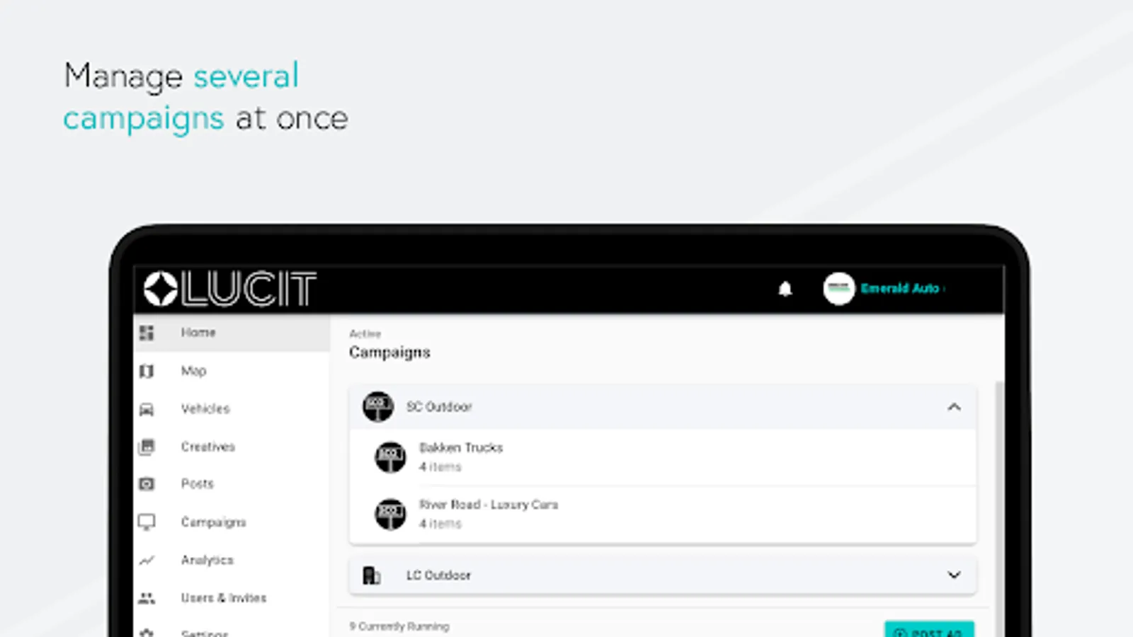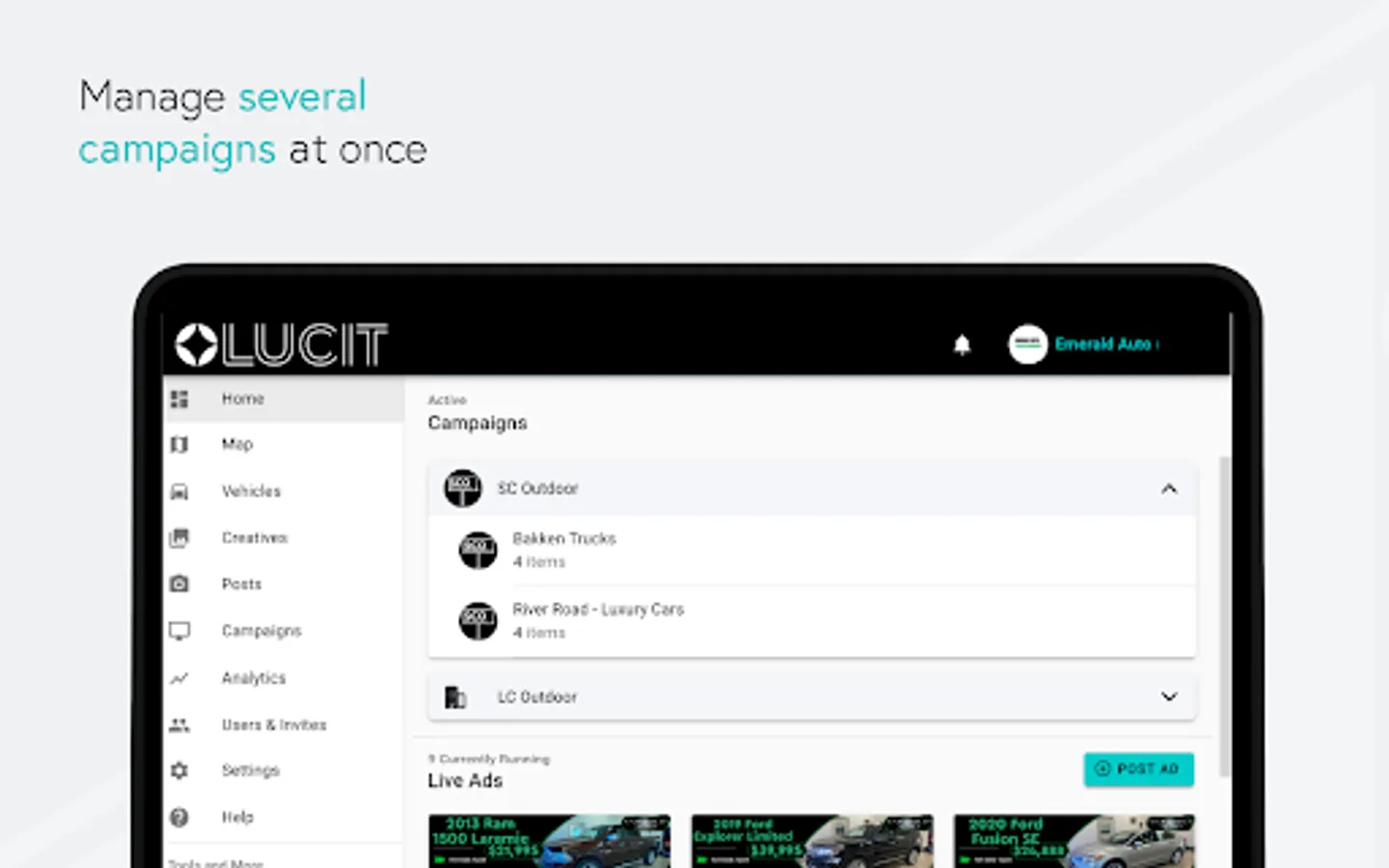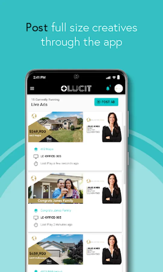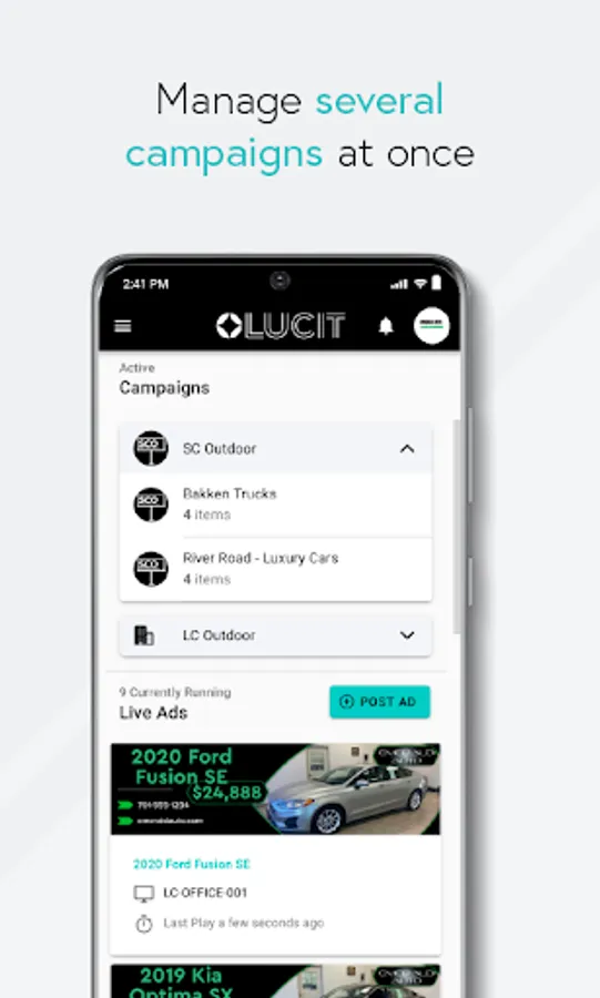 Lucit is ushering the Out of Home advertising industry into a new age by creating cutting-edge technology that’s easy to use for both operators and their clients. By connecting directly to inventories of different industries such as real estate, automotive, agriculture and big equipment dealers, and more, Lucit creates seamless, beautiful creatives and puts the control in the hands of the advertiser. Anytime, Anywhere. This saves the operator labor hours, secures their renewals, and optimizes creative and campaign plays.