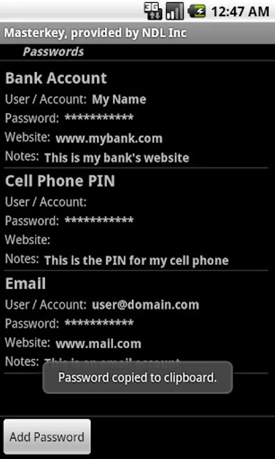 Masterkey is an easy to use password manager for the Android platform. Designed primarily as a password keeper, it can easily be used to house a variety of sensitive information.