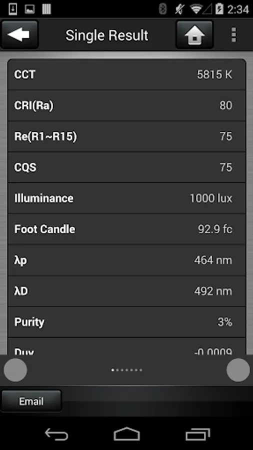 Spectrum, CCT, CRI, R1~R15, CQS, Illuminance(lux), Foot Candle, λp, λD, CIEx , CIEy, CIEu’, CIEv’, Purity, C78.377-2008, IEC-SDCM, and so on.
