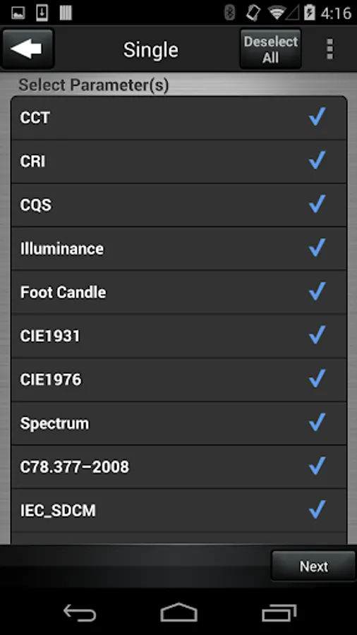 Spectrum, CCT, CRI, CQS, Illuminance(lux), Foot Candle, λp, CIEx , CIEy, CIEu’, CIEv’, C78.377-2008, IEC-SDCM, and so on.