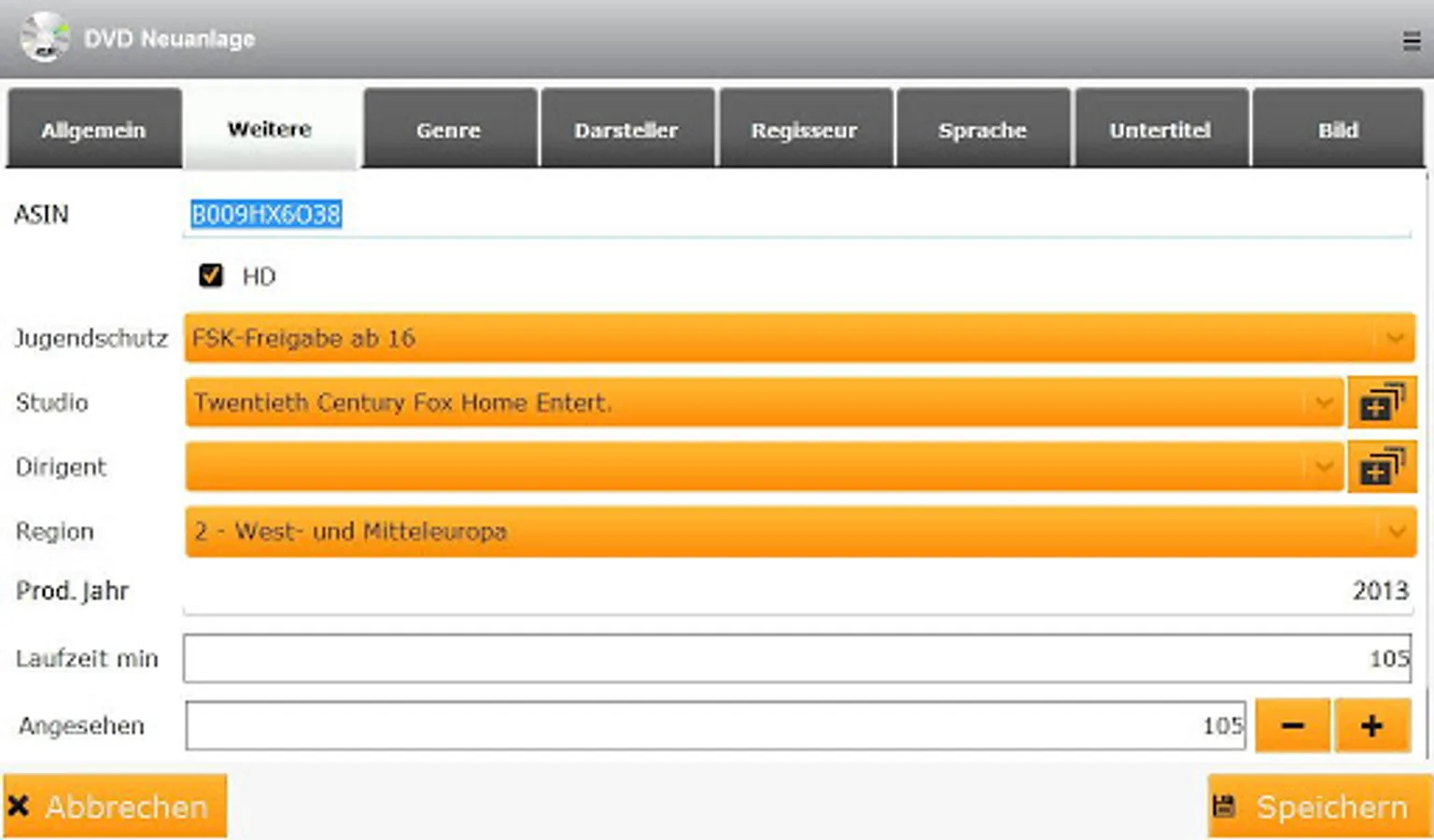 • Enhanced search function, also genre, type (DVD or Blue Ray), Extras (metal, aso.) and the supported languages of the DVD or Blu-Ray.