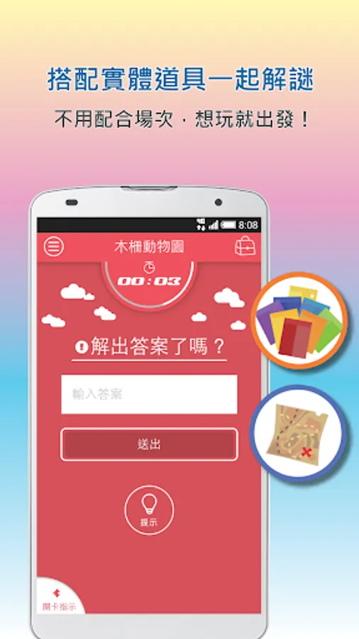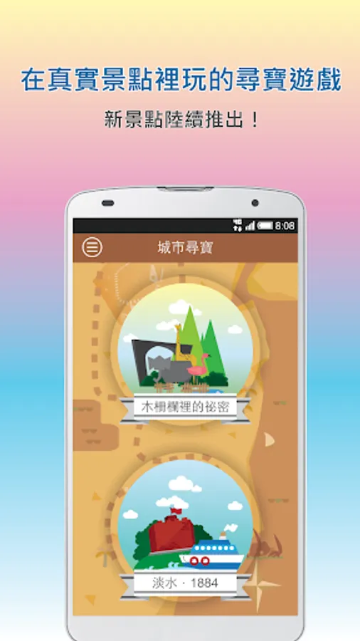 Treasure hunting games played in real attractions, the app solves puzzles together with physical puzzle props, and runs around the city to find treasures!