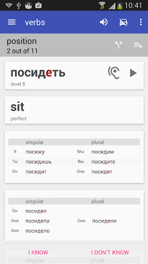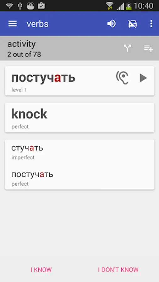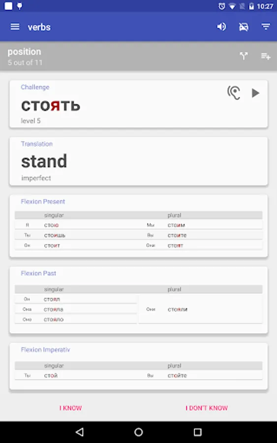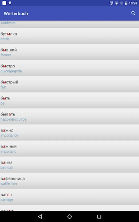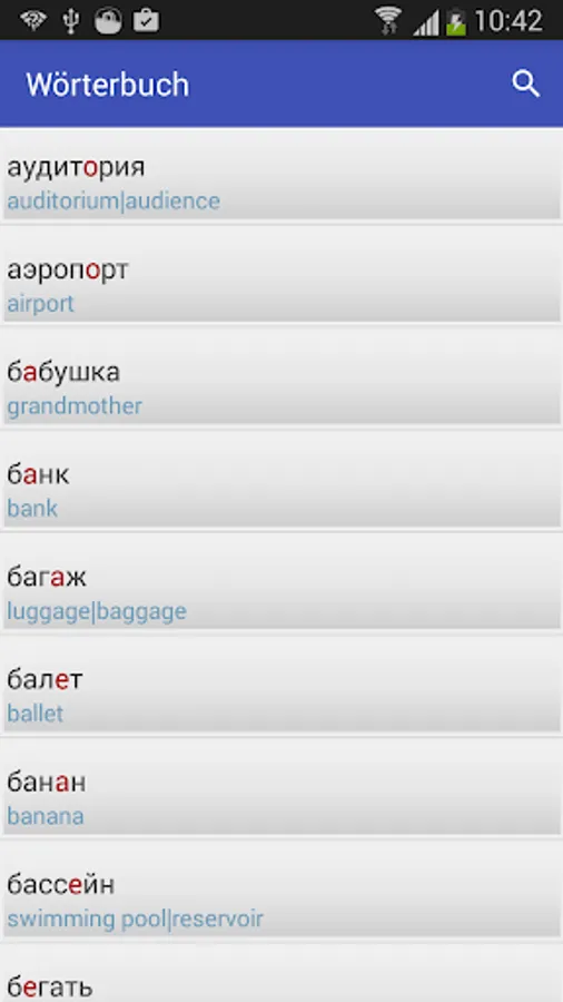 Russian in Words is designed for those, who want to dive deeper into the Russian language. Besides the pure translations you also will learn declinations and conjugations. For those who want to build up their pool of words quickly whithout diving into the the grammatical cliffs: We have an alternative app called "Russian in Pictures" in the play store.