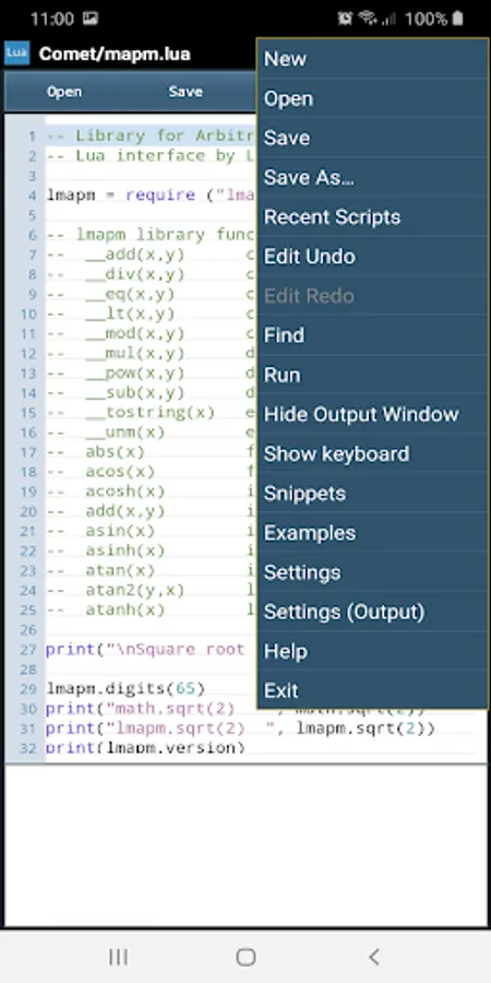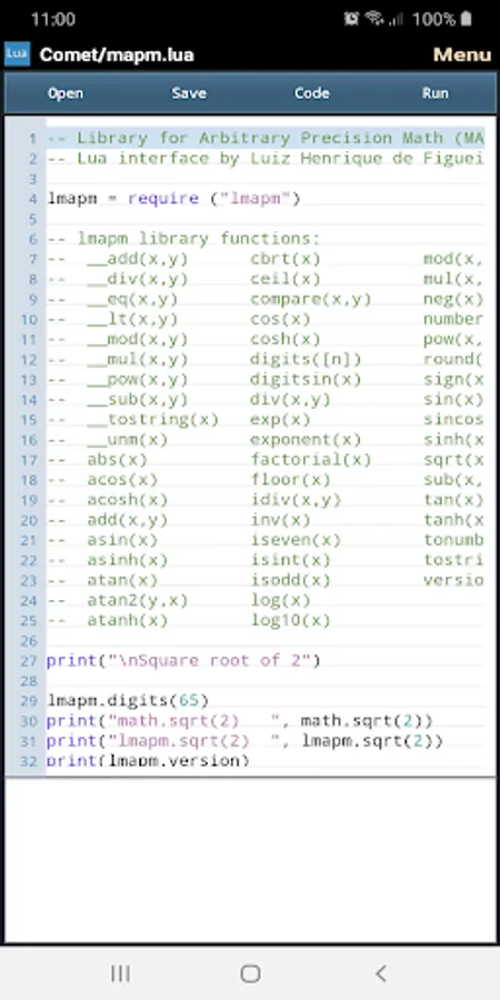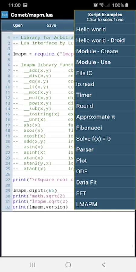 The main goal of Cometis to provide an editor and scripting engine for Lua on Android, particularly suitable for numerical computing and data analysis. With Comet, you can learn programming on your smartphone or tablet, develop algorithms with one of the most elegant and fast scripting languages.