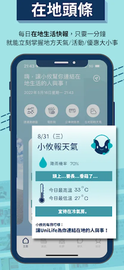 A daily local life news, it only takes less than a minute, allowing you to immediately grasp the practical information such as local weather/events/promotions!