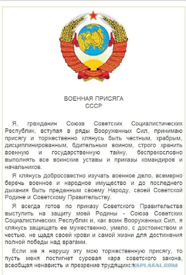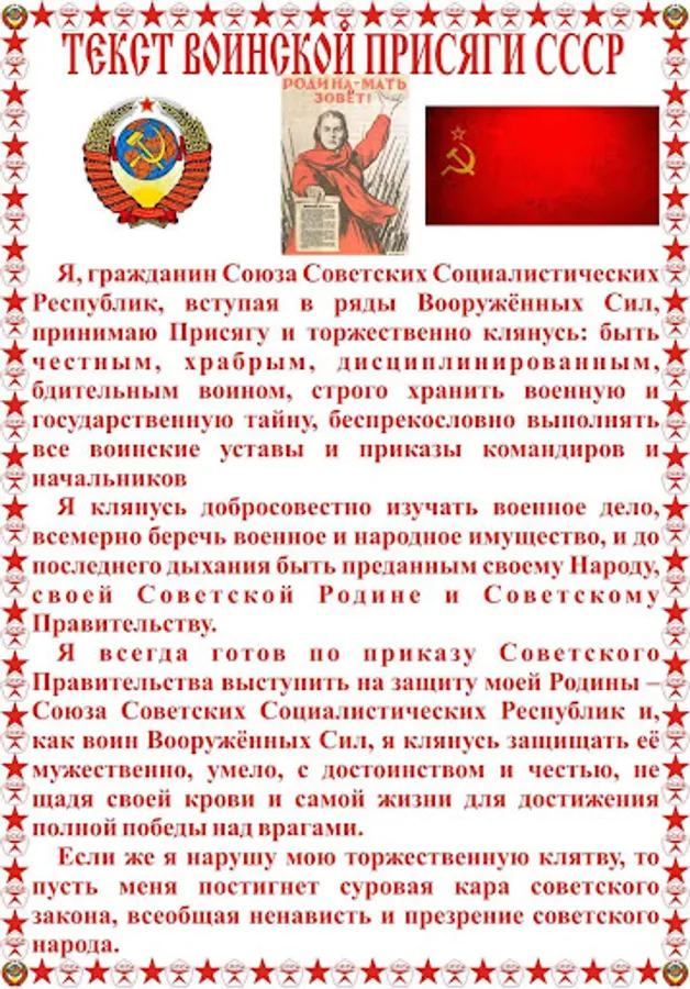 Military oath of the Soviet Union - the ceremonial solemn oath to give each citizen when you receive (call) for military service in the armed forces of the state. Military oath existed since ancient times in the Armed Forces (AF) of most countries in the world. In various sun has its specific content, traditions and ceremonies for its adoption, depending on the historical traditions and customs of a people (peoples), its sun and the essence of the system state.