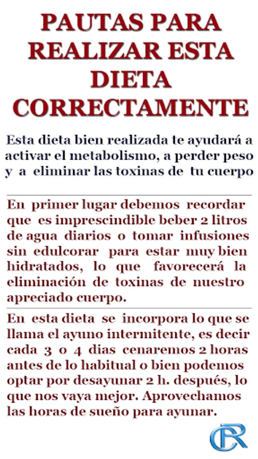 With this diet you get to lose weight without starving, will combine the technique of intermittent fasting, this fast is to extend every three or four days the time between dinner and breakfast activating the metabolism and better remove fats from your body, combined with menus very light twice a week, but without starving, since it has taken into account to provide the necessary nutrients and satiety.