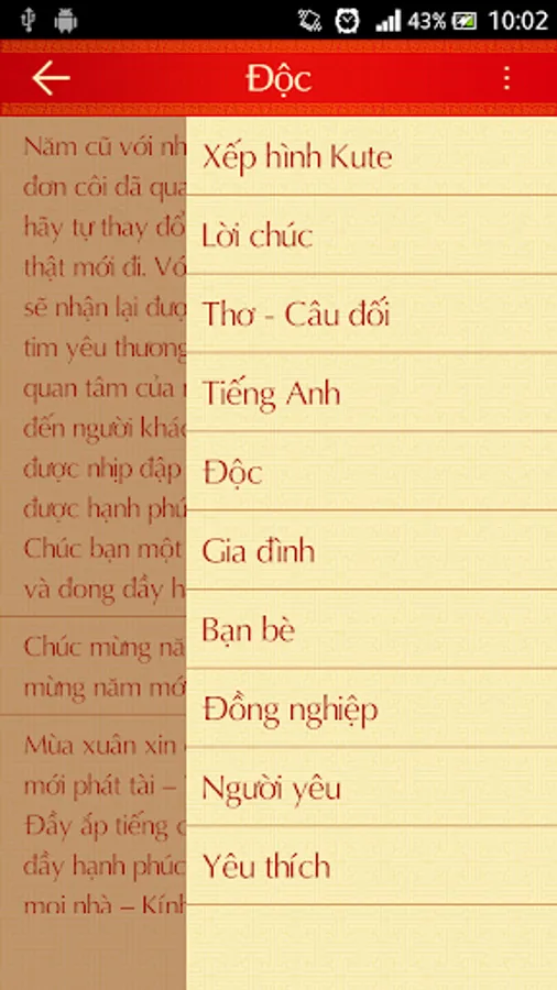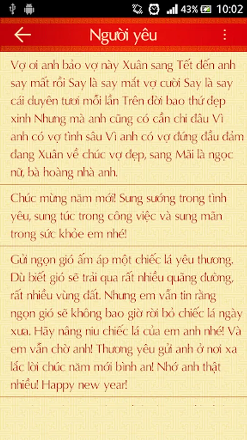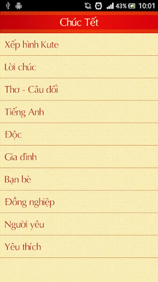 Free app helps you send sms messages with lots Tet New Year's greetings or templates, unique, distinctive, including: Icon Kute, Fun, couplets, blank pages, Good English, built .. for friends, family, loved, colleagues ...