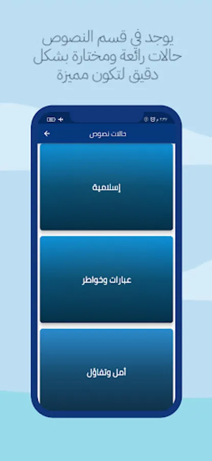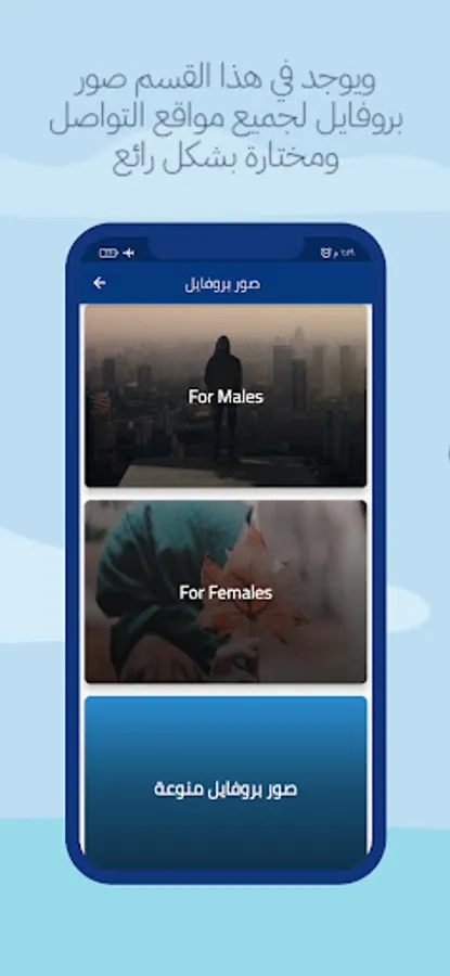 The application contains four main sections; A section for photo cases, a section for text cases, a section for video cases, and a section for profile pictures. As each section in turn contains many sub-sections such as the section of wisdom, thoughts, jokes, Islamic, friendship ... etc.
