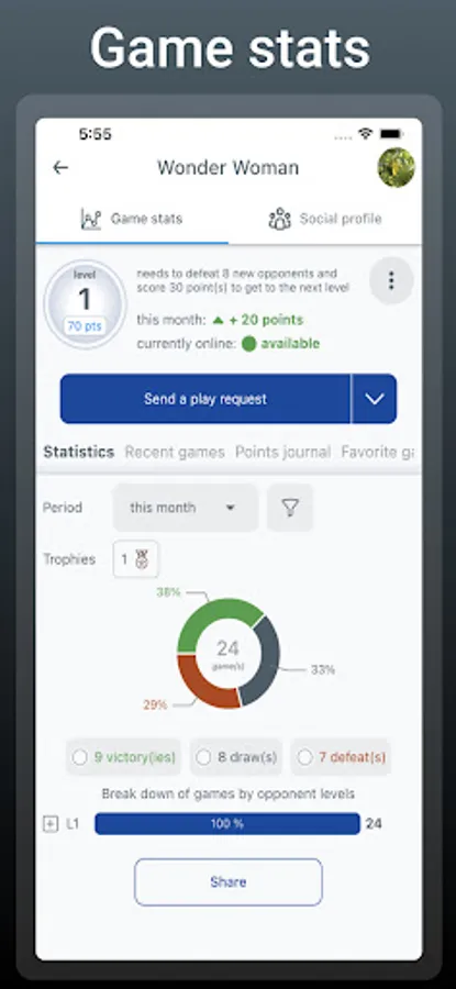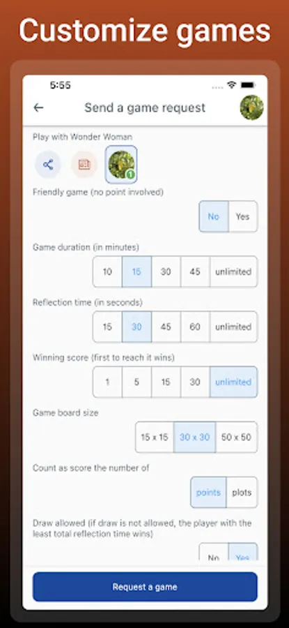 The game is completed when either a winning score is reached or when the play time is over. The player with the highest score wins.