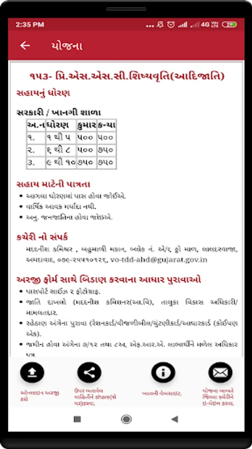 Tribal development department of Gujarat, implement numerous schemes for the welfare of tribal community in the state. The population of the tribal community is more than 90 lakhs. This android based mobile application aims at disseminating the information of welfare schemes for individual beneficiary of the tribal community. Nowadays Mobile phones are widely used as a communication device which have penetrated to the remotest areas of the state. Hence this medium is used for disseminating the information of welfare schemes to the tribal community. This android based mobile application has been created with the cooperation with of Vikaspedia project. This application provides information of welfare schemes for individual tribal beneficiaries in a very simple and easy to understand format so that maximum eligible tribal beneficiaries can get benefitted of the welfare schemes.