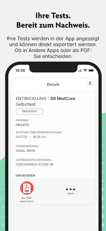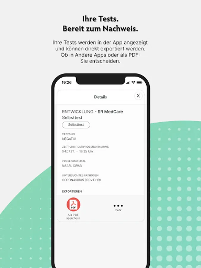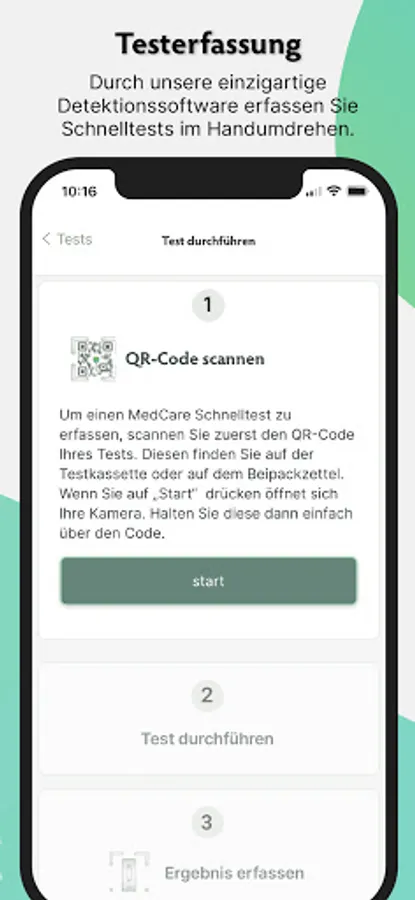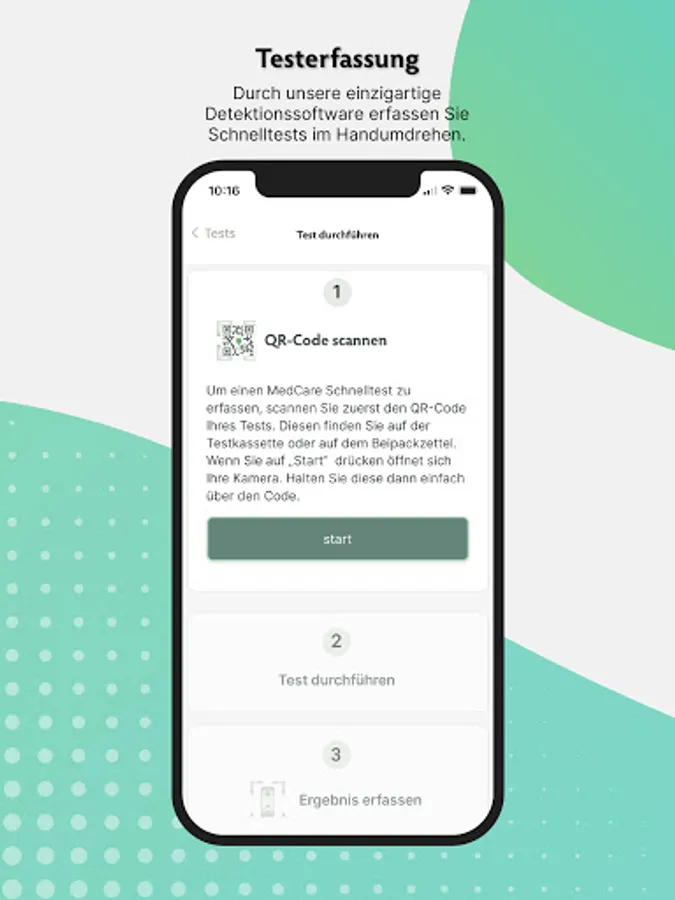 Record your test result with the MedCare app. Our algorithm uses artificial intelligence to evaluate your test result. You can then prove your test result, encrypted and provided with a time stamp.