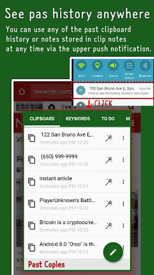 - You can use any of the past clipboard history or notes stored in clipboard notes via the upper push notification anytime, anywhere.