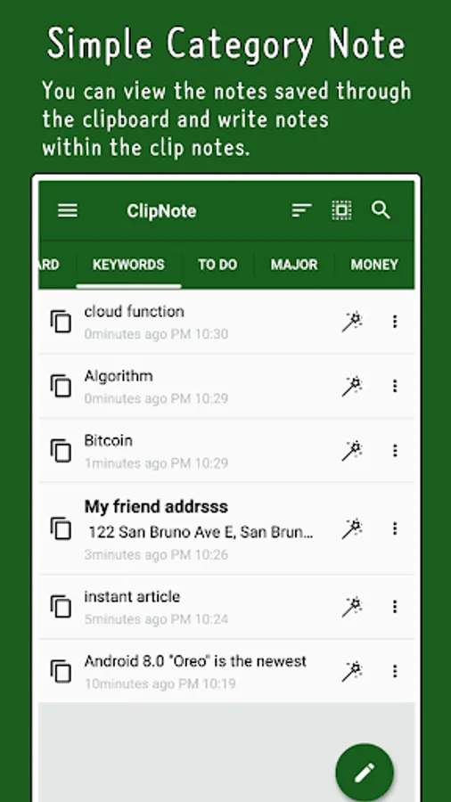 - By category, you can easily save the copied contents to the clipboard and quickly find the notes when you need them.