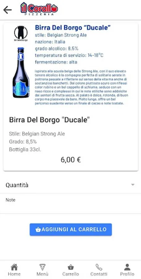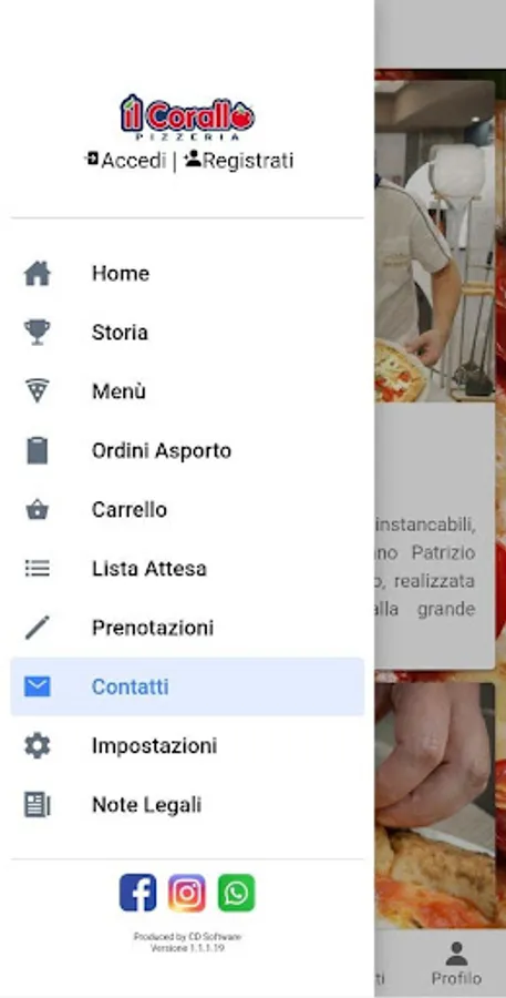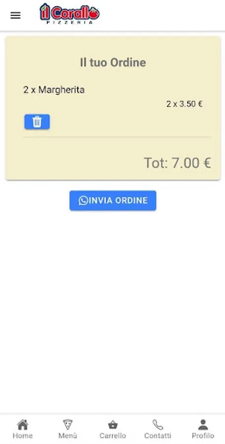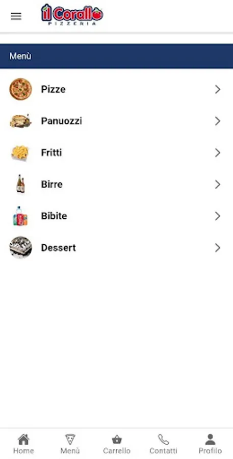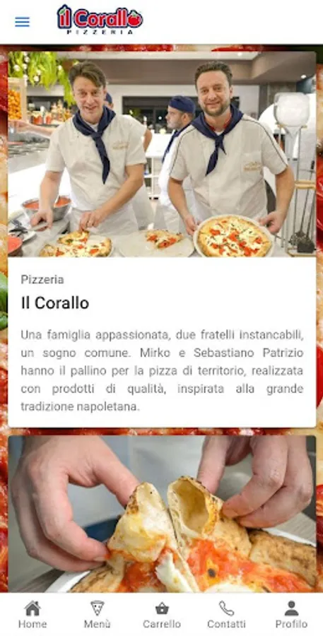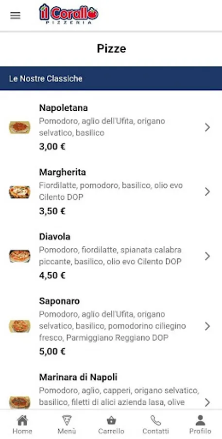 Il Corallo pizza menu application. The app allows you to send an order for takeaway, request a table reservation, enter the waiting list.