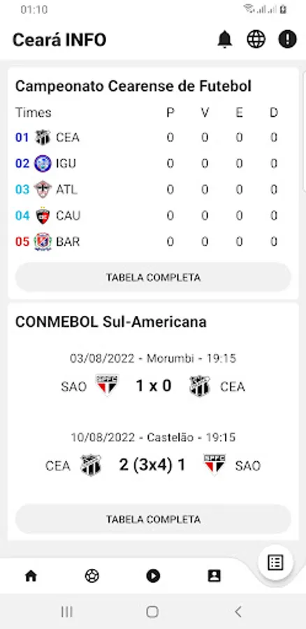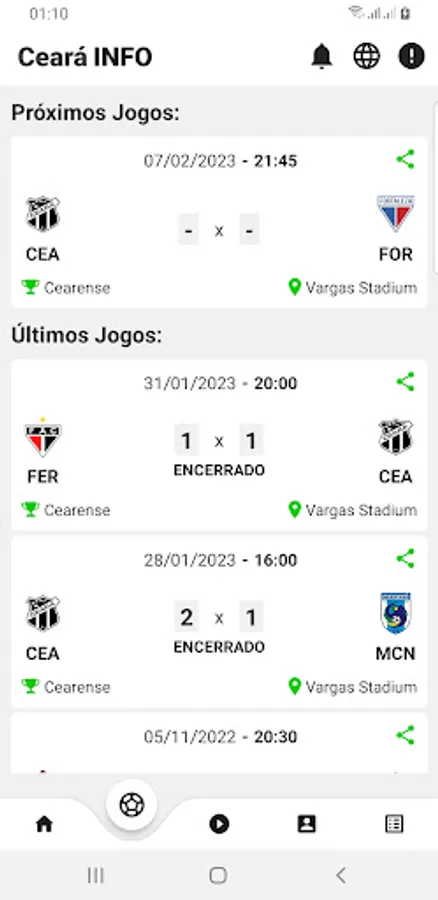 Ceará is currently participating in the following championships: Campeonato Brasileiro Série B, Copa do Brasil and Campeonato Estadual. With Ceará Info, Ceará fans can follow the club's classification in real time and stay on top of all the news of the games, such as lineups, goals and final results. In addition, the app offers up-to-date news about the club, allowing fans to stay on top of everything that is happening in Ceará.