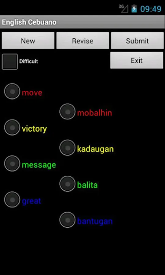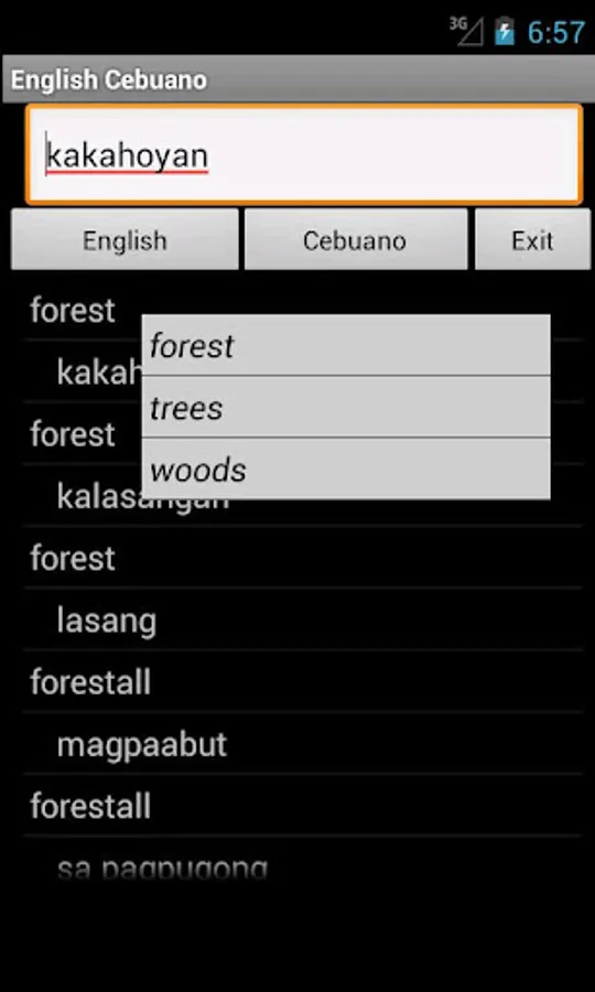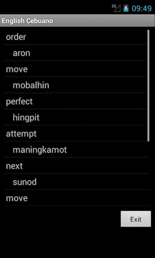 Cebuano English Dictionary – (Binisaya or Visayan) – travel dictionary to translate Cebuano to English displaying a list of matching words. The dictionary also translates from English to Cebuano. Copying a word from the translated list for a reverse translation can be used to find synonyms and to understand the broader use of the English word in the Cebuano language. Although the Cebuano English dictionary does not provide definitions or examples, the use of the translation software in this way provides you with a mechanism to better understand English words in the Cebuano context without the need for definitions. 20K references.