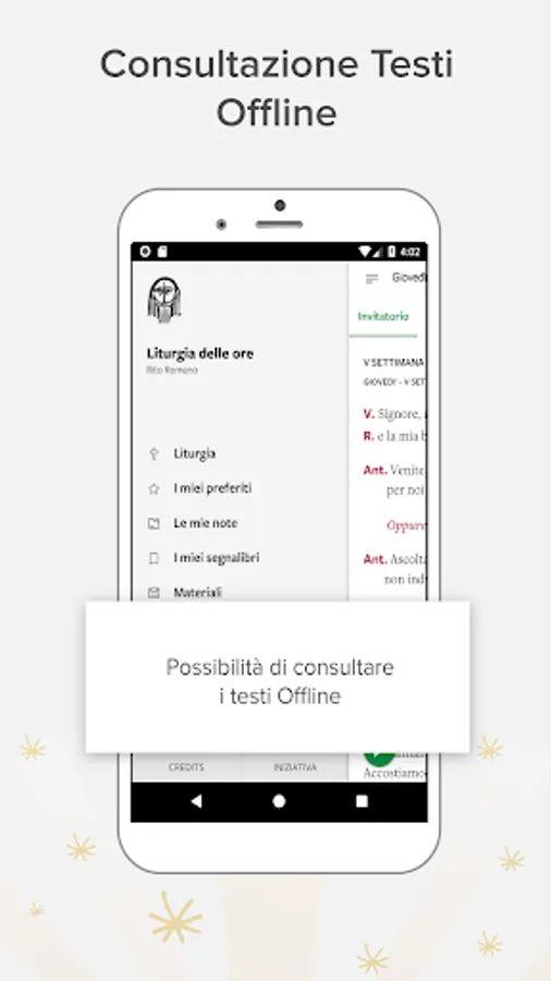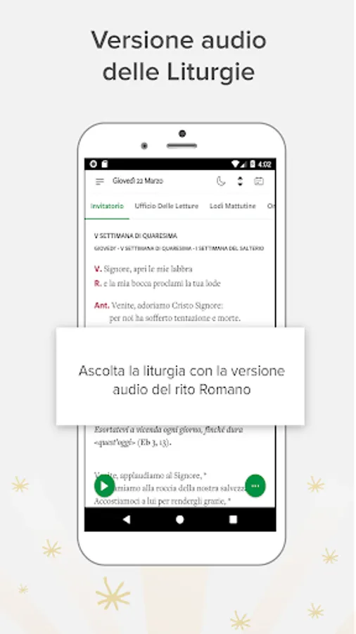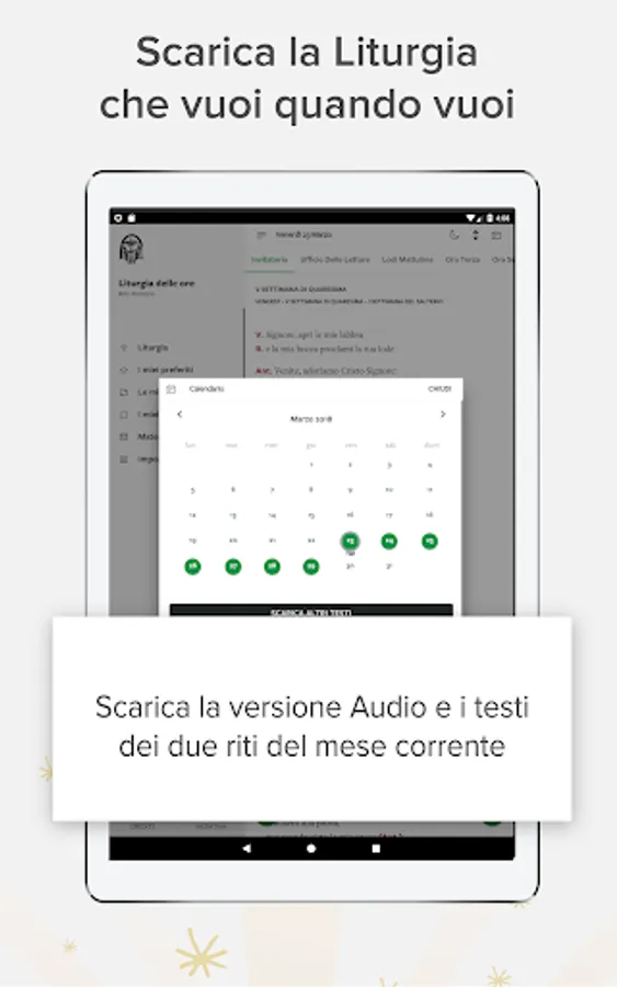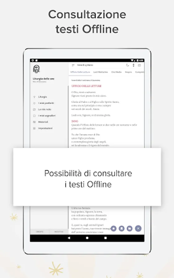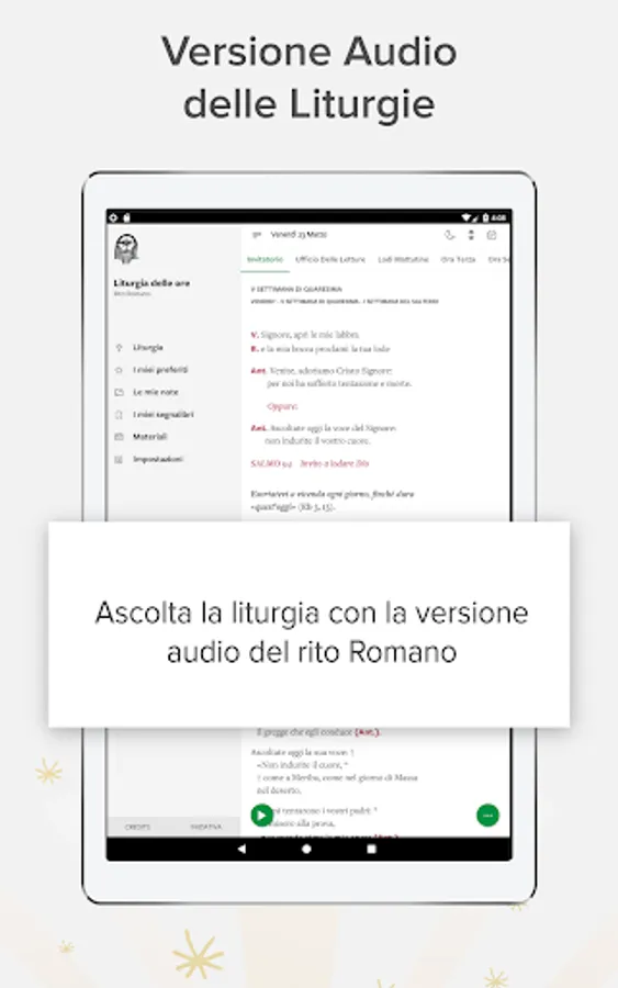It 'the first APP to propose, in addition to the use of the official text of the Liturgy of the Hours of the Italian Bishops' Conference, also the audio version of Office several hours throughout the day. Audio support can be especially useful for visually impaired people.