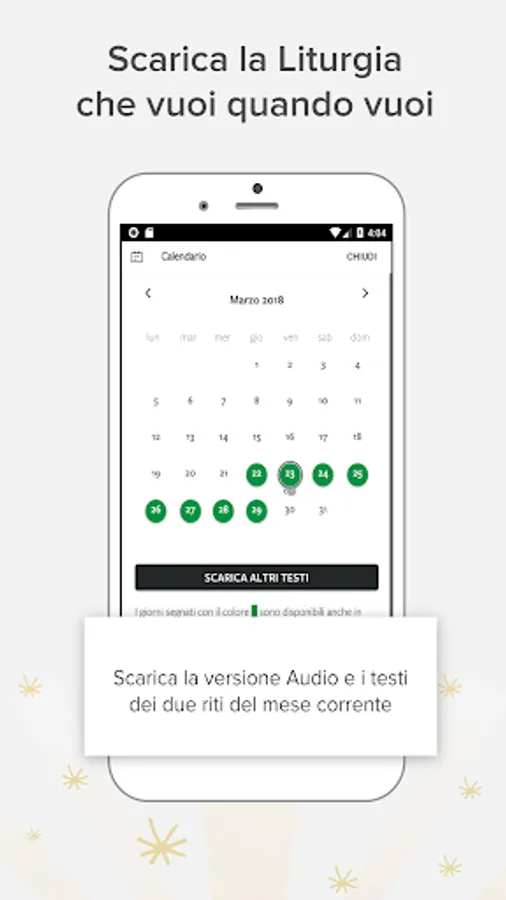Complete the app CEI - Liturgy of hours, a new fully modern twist graphics, accurate read functions, navigation, search, and a new audio player. It allows, with a number of utilities comfortable, insert bookmarks and personal notes to store them and carry them with him and shares in different ways. The app allows the ability to save a liturgical day for offline browsing of text and audio.