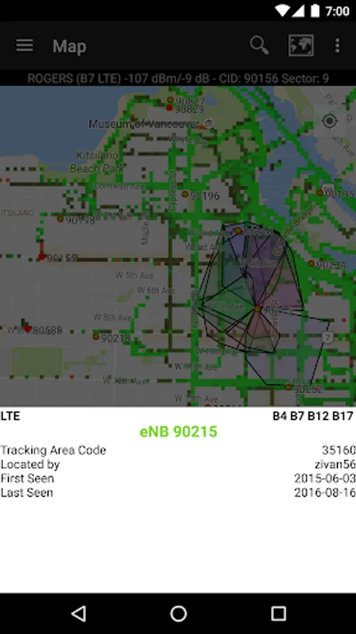 - Displays a map of both coverage and individual tower sector coverage and bands
