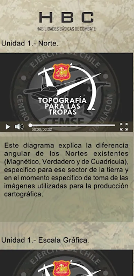 The contents of the application are based on the "Basic Combat Skills" that are provided by the Chilean Army for the Land Force.
