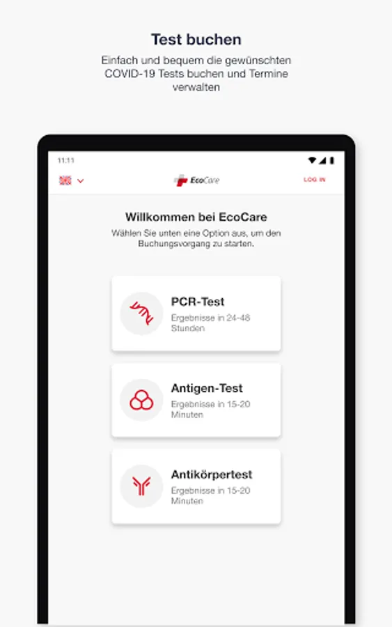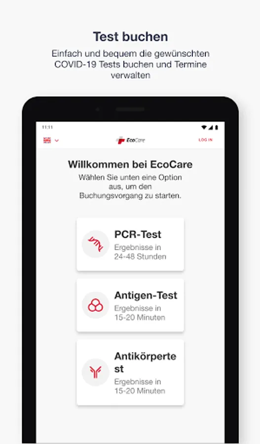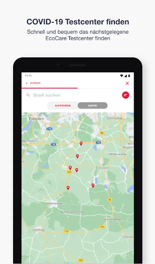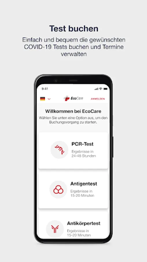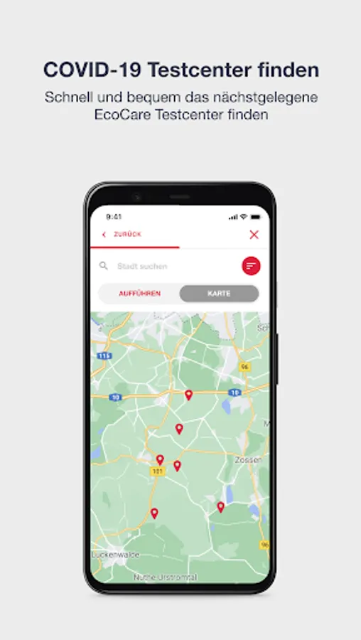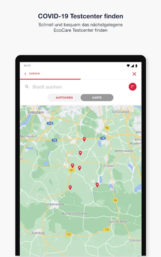 The Ecocare app helps the user to find the nearest available test center to perform a rapid test or PCR test.
