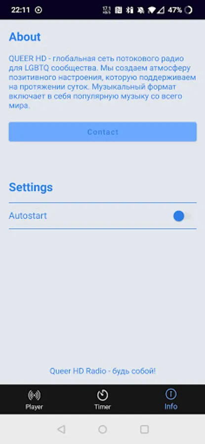 QUEER HD is a global radio streaming network for the LGBTQ+ community. We create an atmosphere of positive mood, which we maintain throughout the day. The music format includes popular music from all over the world.