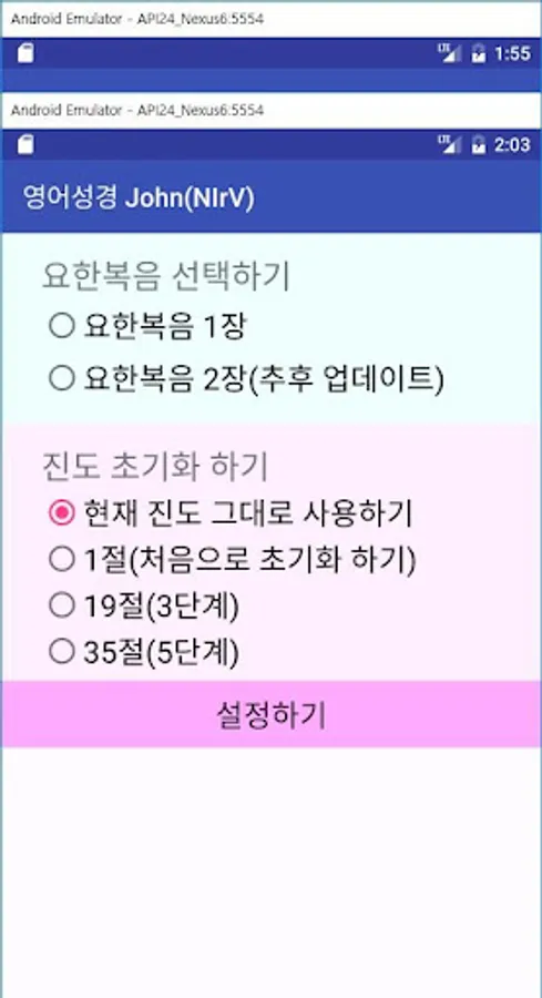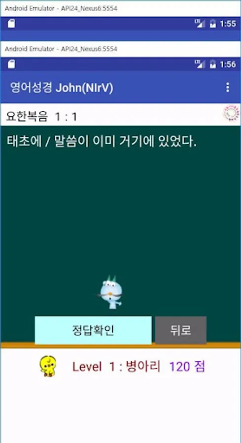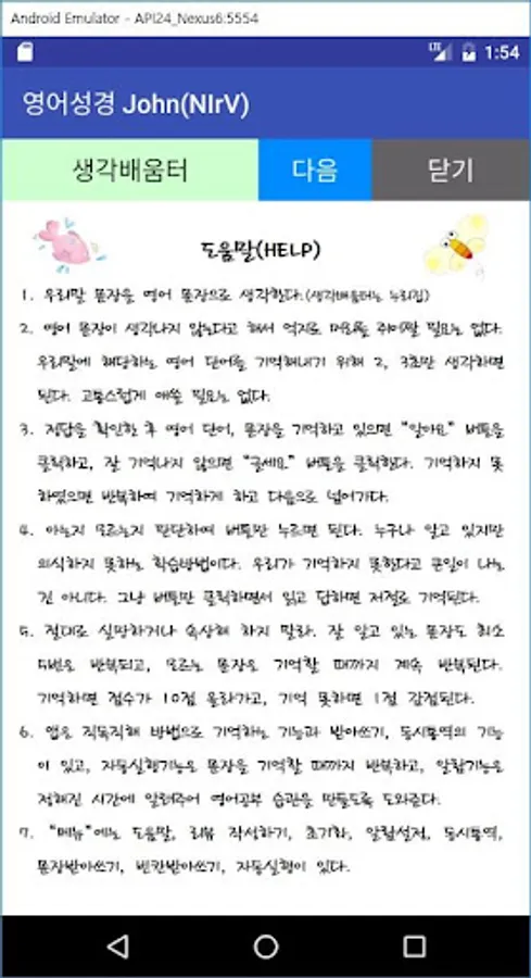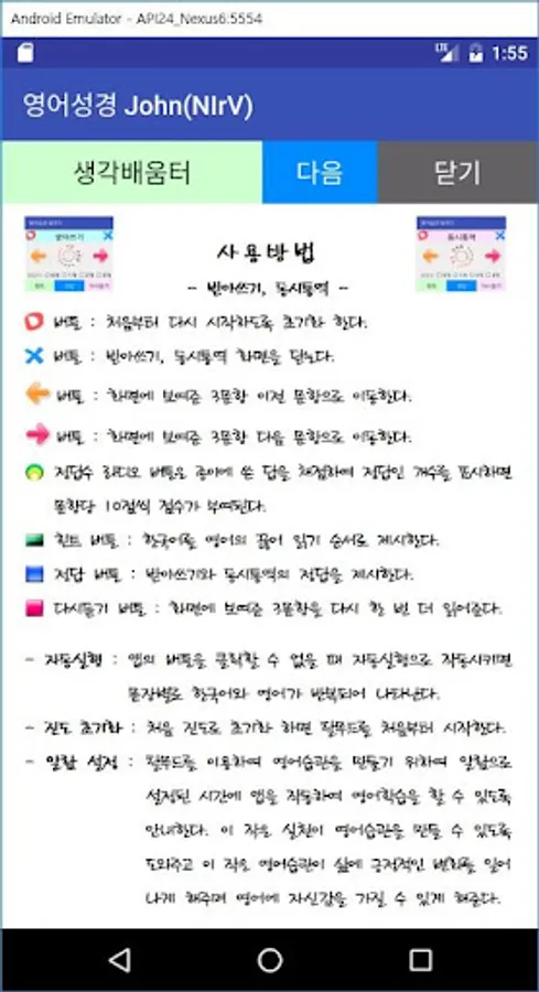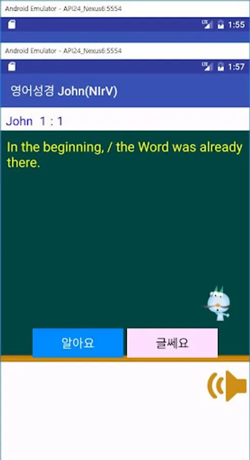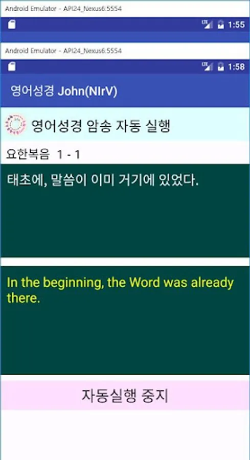 The NIV Bible is if the 'adult' NIrV (New International Reader's Version) Bible is equivalent to the 'Children'. NIrV Bible is the level of vocabulary and sentence length, etc. but the NIV Bible and content are described in plain English tailored to the child's eye level. Therefore, it is very suitable for beginner English learners to recite the NIrV Bible with us. This application is for beginners and will use the NIrV Bible, it plans to use the NIV Bible to intermediate English learners. In addition to the natural Korean statement she quoted the 'modern man in the Bible (KLB)' Hangul and King James (KRV) '.