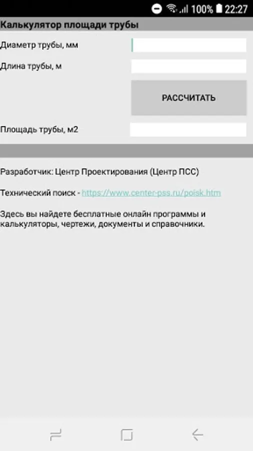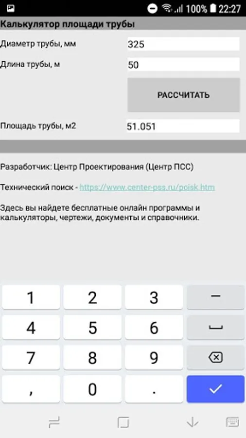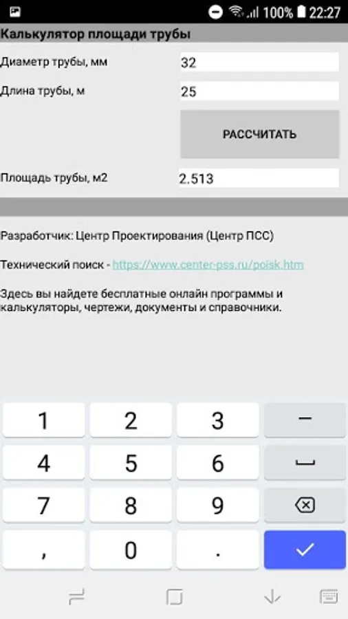 The simplest program for calculating the area of a round pipe depending on the outer diameter of the pipe and its length.