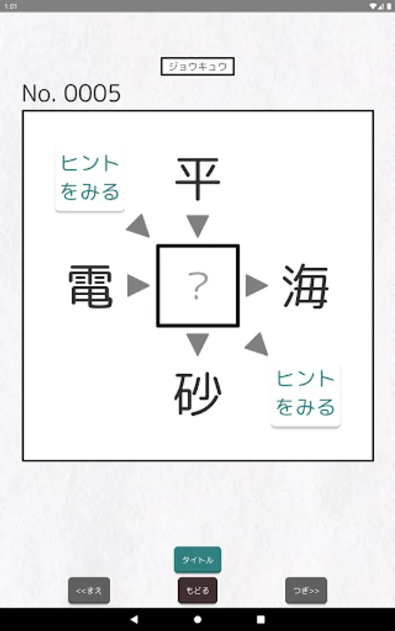 "Nijiume" is a puzzle that guesses one kanji that goes into the center of the cross so that four two-character idioms are completed.