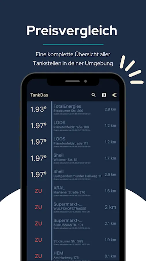 When the fuel prices drop, you can set a price alarm for the respective gas station. If the fuel prices fall, you will receive a notification.