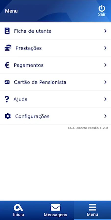 The CGA Directa App provides a set of query features, such as the user form, user form, benefits, payments, pensioner card and messages.