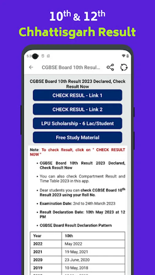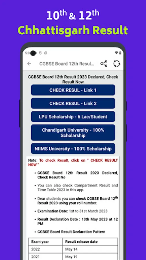 - Real-time Results: get instant updates as soon as the CGBSE 10th & 12th results are announced. Say goodbye to waiting and hello to timely information.