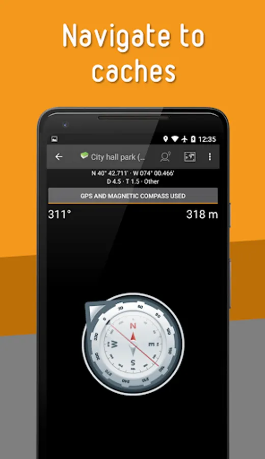 Navigate to a cache or a waypoint of a cache with the built-in compass function, the map or hand over the coordinates to various external apps (e.g. Radar, Google Navigation, StreetView, Locus, Navigon, Sygic and many more).