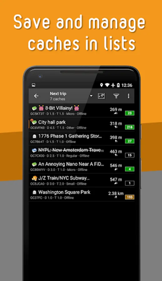 You can manage your stored caches in different lists and can sort and filter them according to your needs.