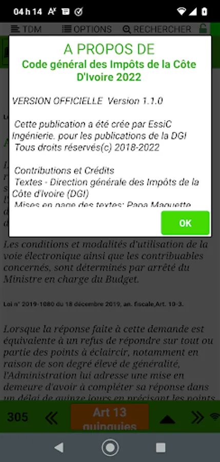 The Publisher of this application "L es publications de la DGI" and its Producer "Essic Ingénierie", are proud to present to taxpayers this tool which makes Ivorian tax legislation accessible at your fingertips.