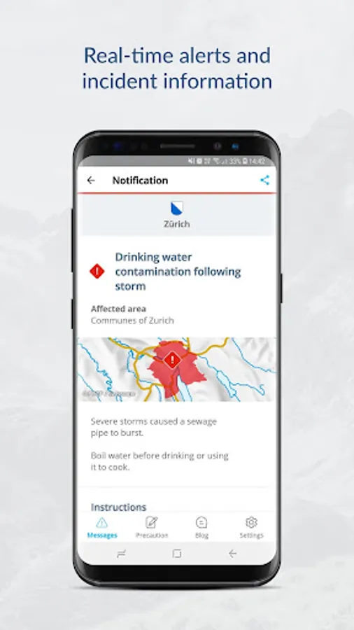 Disaster can strike at any time. Luckily, there is Alertswiss, a mobile app developed by the Federal Office for Civil Protection to help you plan for and stay safe in an emergency. With Alertswiss, you receive alerts, warnings and information in real time. So that you always know exactly and immediately what action you need to take, the Alertswiss app sends you push notifications on the incident, including valuable tips and instructions on how best to protect yourself and your family.