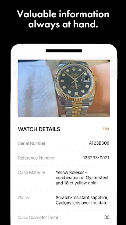 We believe that the history of your watch is worth preserving. As Rolex states "It doesn't just tell time. It tells history". Download our app and get your certificate that proves the authenticity of your watch. The complete history from first purchase to service, repairs, and transactions of the watch can be recorded and made available. Keep your watches with you, wherever you go and share the unique story of your watch with your friends and family.
