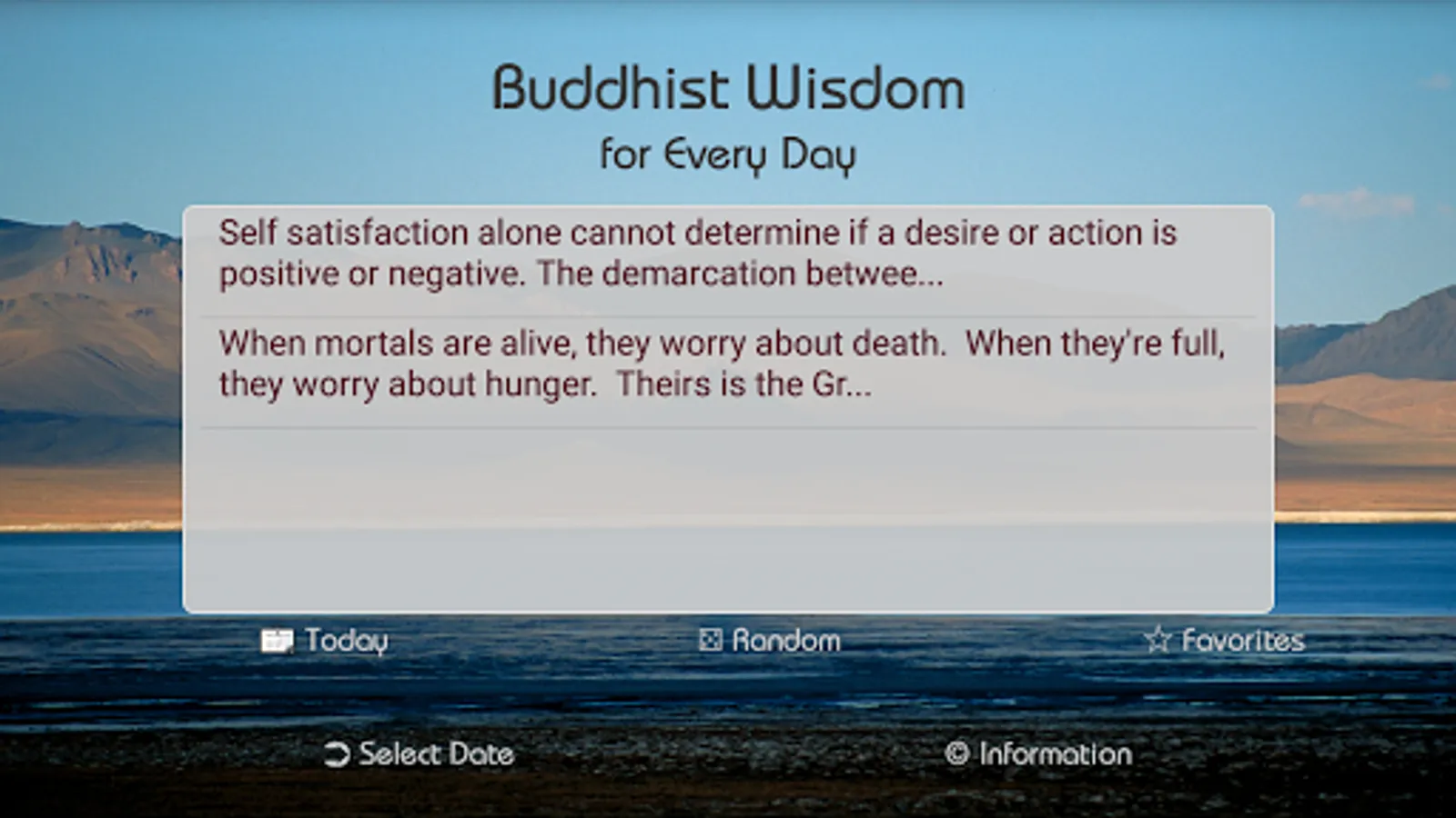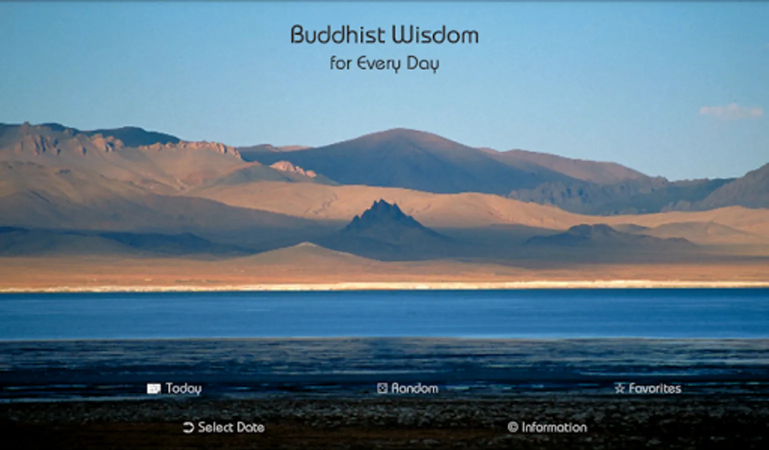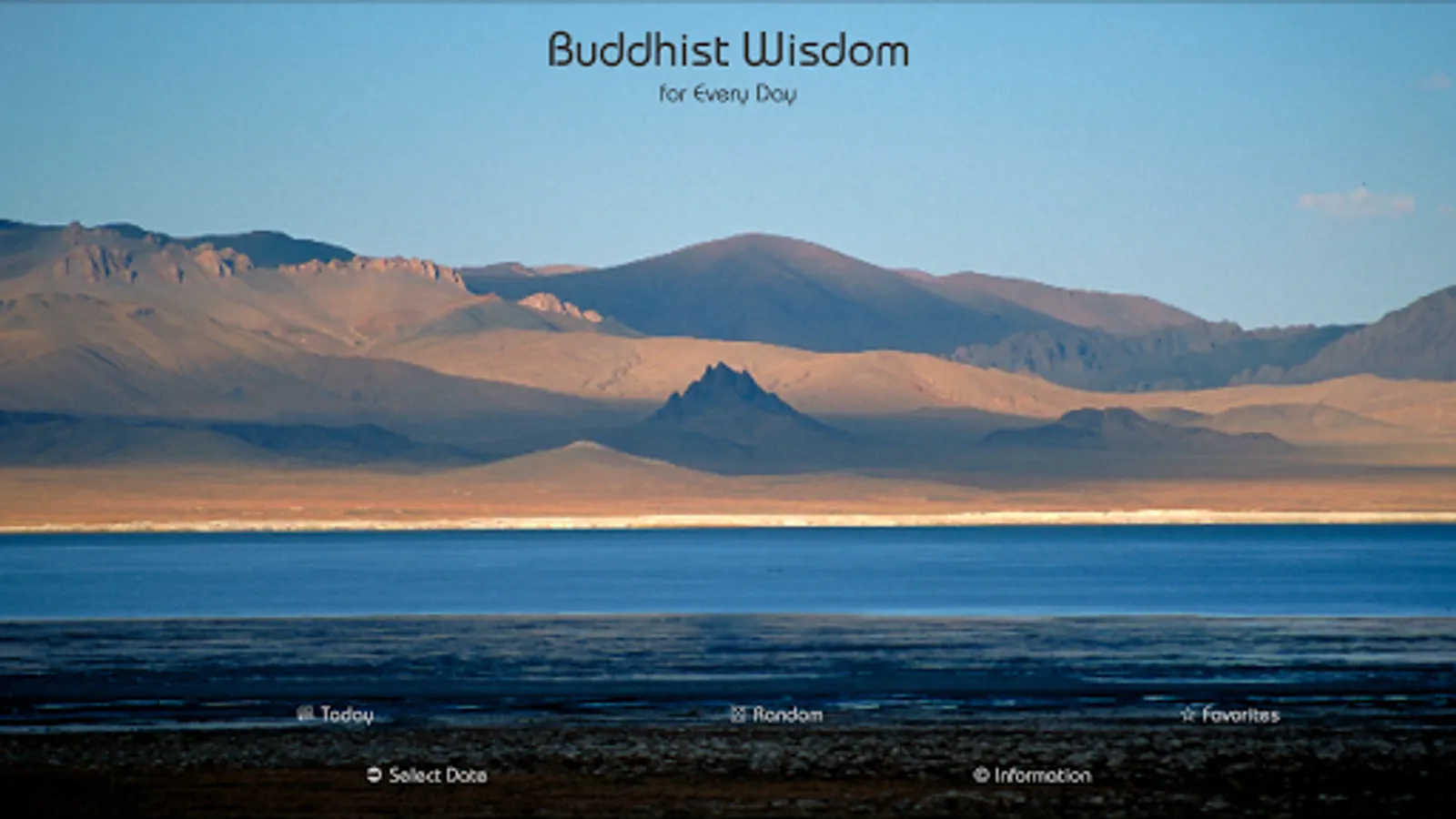 The App shows inspirations in front of pictures of the buddhist world around the globe. You can select today's wisdom, let yourself be inspired randomly or select from a list of personal favourites. A complete reference is available on the support webpage.