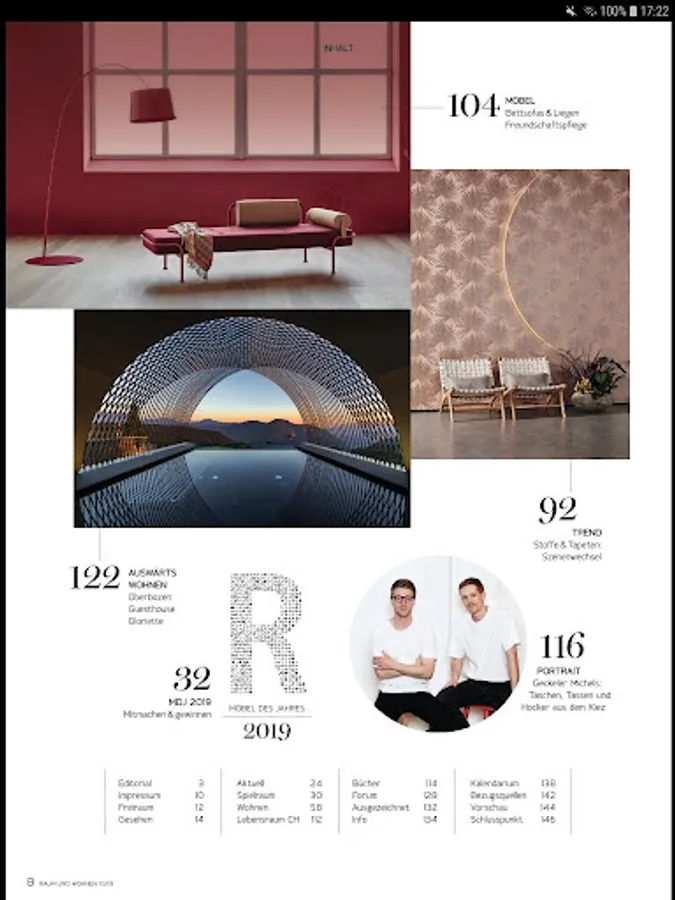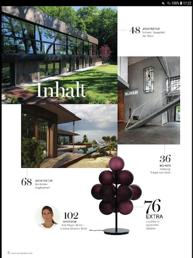 Generous reports on contemporary interior and exterior architecture in the single-family home area inspire when redesigning or redesigning your own home. Comprehensive reports from the most important European furniture fairs show the latest trends in the furnishing and furniture sector or designer portraits provide interesting background information about the furniture scene and its products. Specialized topics also regularly provide valuable information on the latest products including reference addresses, such as tables and chairs, upholstered furniture, beds, loungers, system furniture, cupboards and shelves, lights and lamps, kitchen and bathroom furnishings or home office: for whom sophisticated living and good things Design is important, you will find the necessary information and suggestions at RAUM UND WOHNEN!