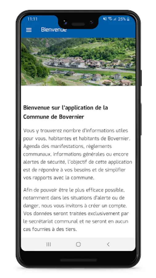 The municipality of Bovernier offers, through this application, a modern and attractive information system. The population and interested persons will thus be able to be informed, in real time and directly on their mobile phones, of the various events, information or alerts published by the authorities. It is therefore a complementary information channel to traditional channels, while allowing better responsiveness, especially for emergency situations.