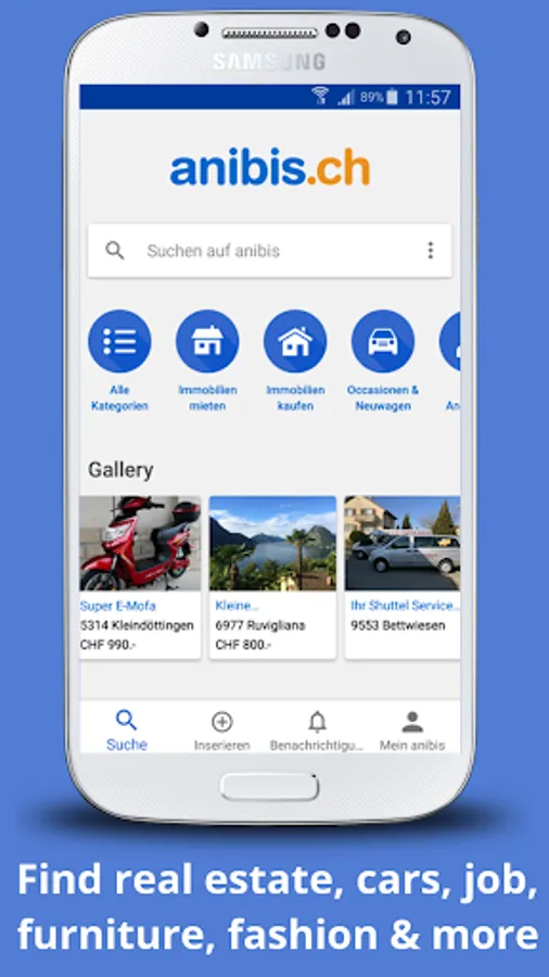 anibis.ch is the most popular marketplace for new and used articles of any kind in Switzerland. anibis.ch provides more than 950‘000 listings from all parts of Switzerland. No matter if you want to buy household appliances or sell your old bed, search for a household help or another service or look for job ads – we have a match for your every wish.