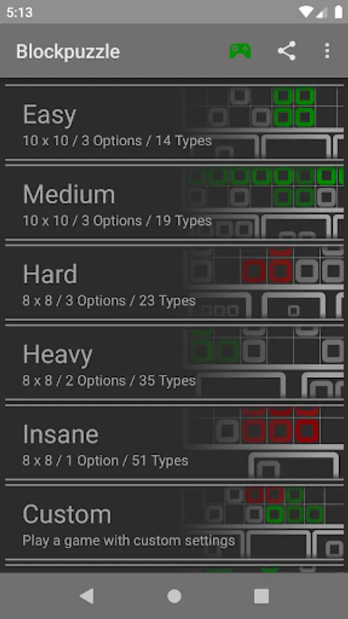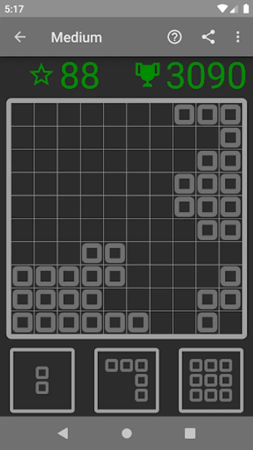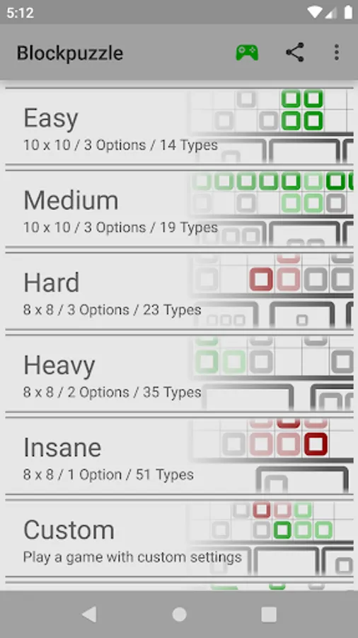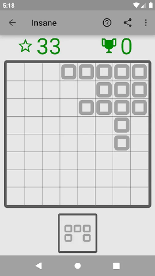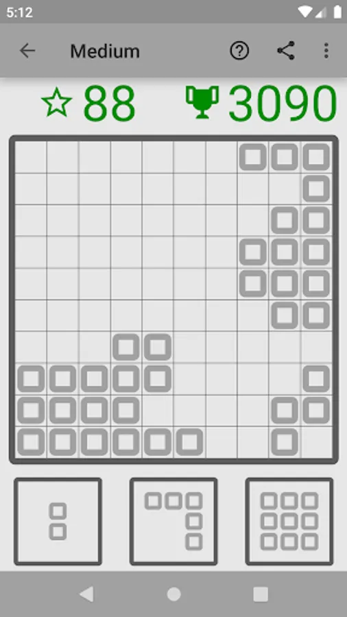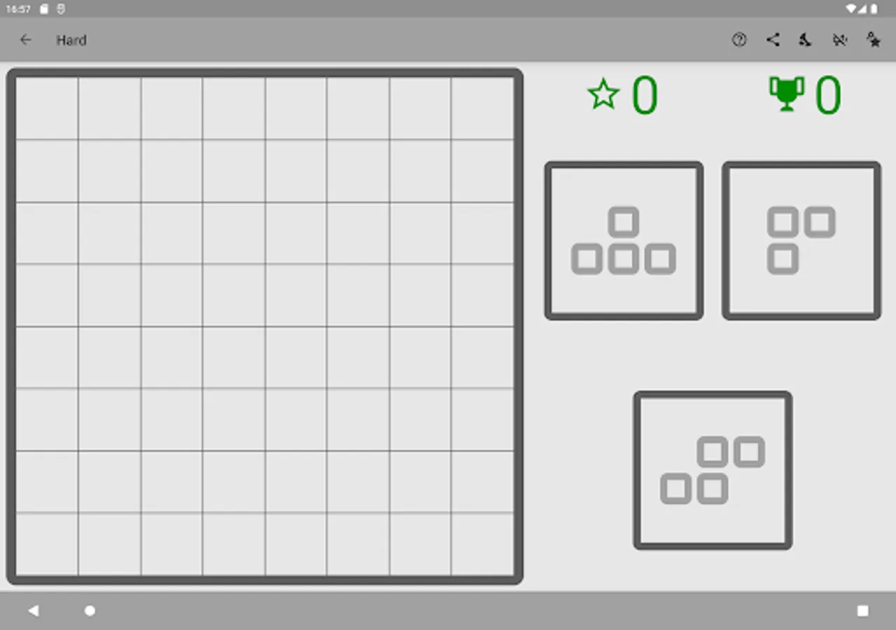Blockpuzzle is a typical puzzle game, where you place blocks to the table. Whenever a row or column is full, it is erased. Every placement and erasure gives you points. The game ends, when there is no more options to place the pieces.