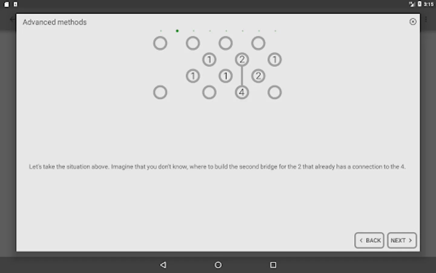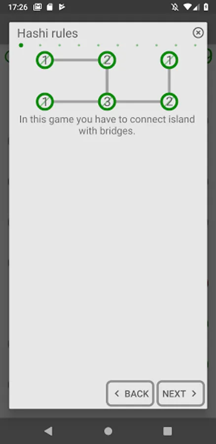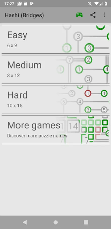 There are different levels in Hashi that have different size of the field. But don't be afraid to try a more difficult level, as every level will be saved, so you can continue on that later.