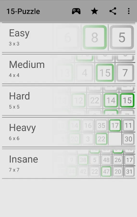 The game offers variant achievements to unlock and leaderboards to compete with other players. Those rely on the number of moves or the time you need to complete a 15 puzzle game.