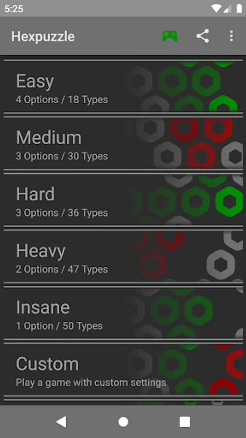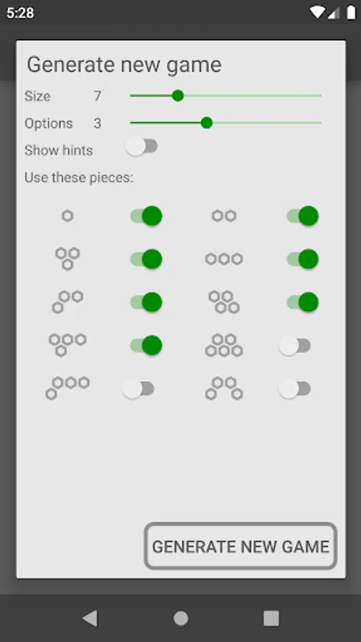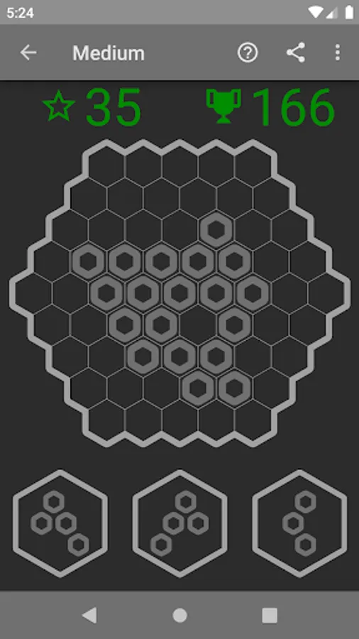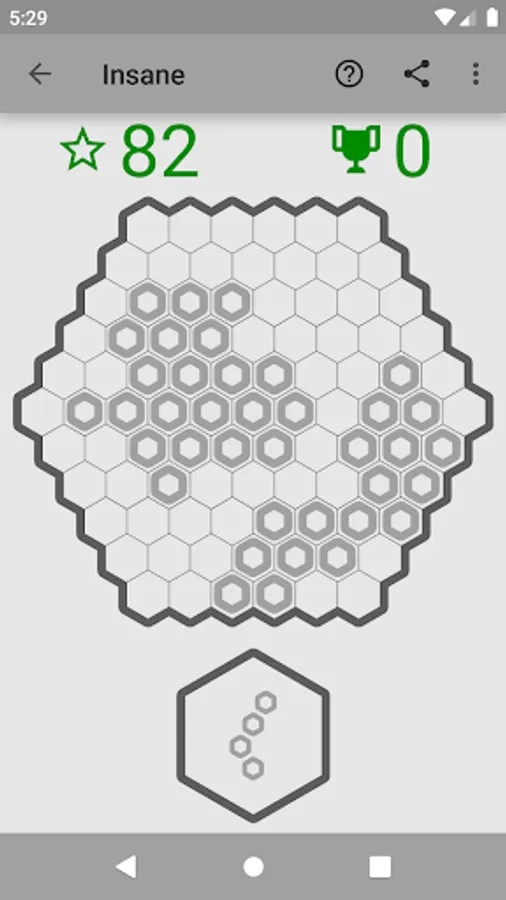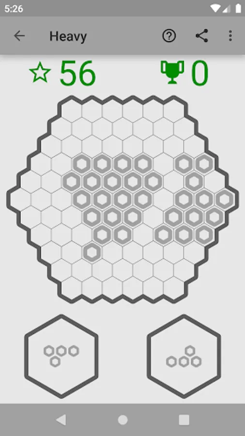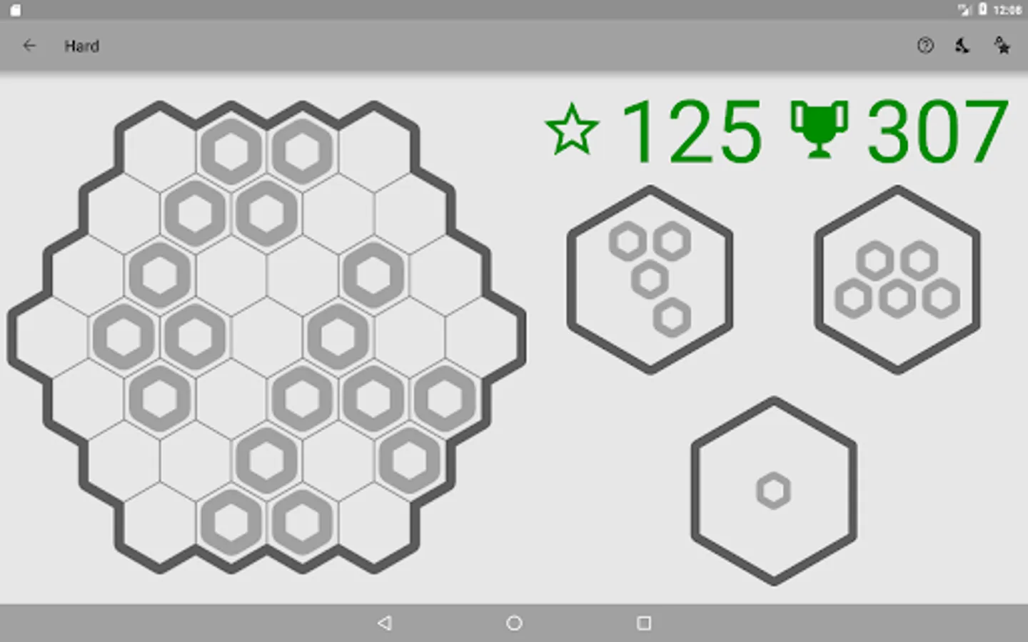 Hexpuzzle is a typical puzzle game, where you place hexagonal blocks to the table. Whenever a row or column is full, it is erased. Every placement and erasure gives you points. The game ends, when there is no more options to place the pieces.